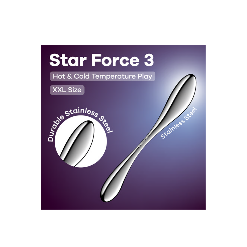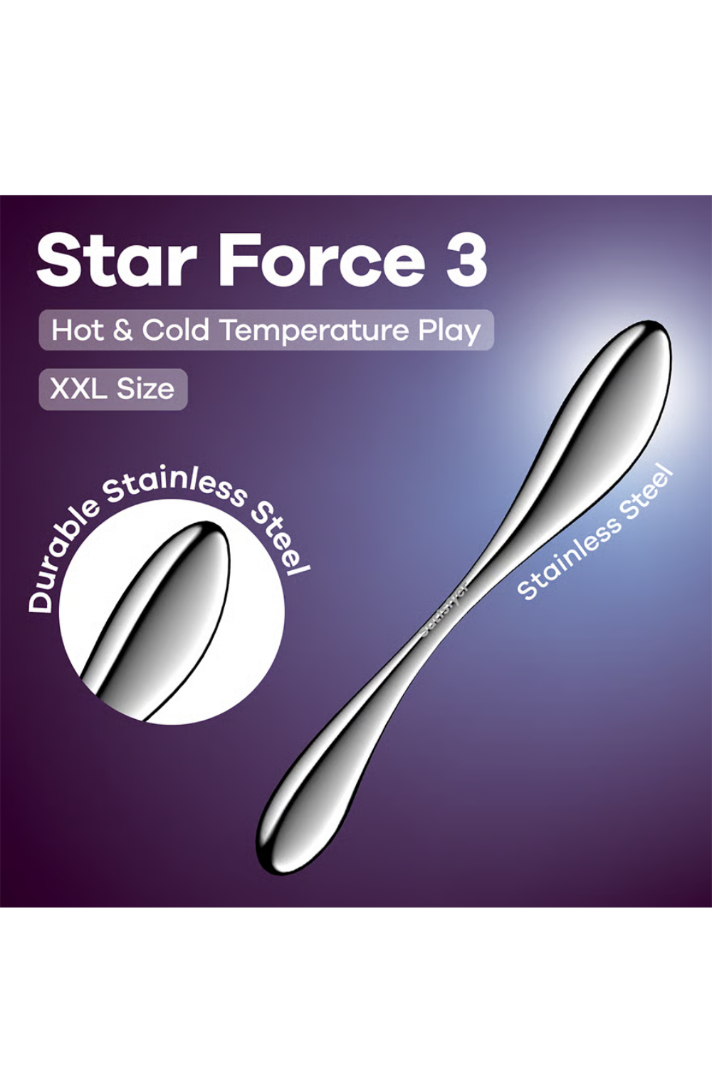 Le Satisfyer Star Force 3 est un gode en acier inoxydable conçu pour offrir une stimulation variée grâce à sa forme double face et son poids élevé.