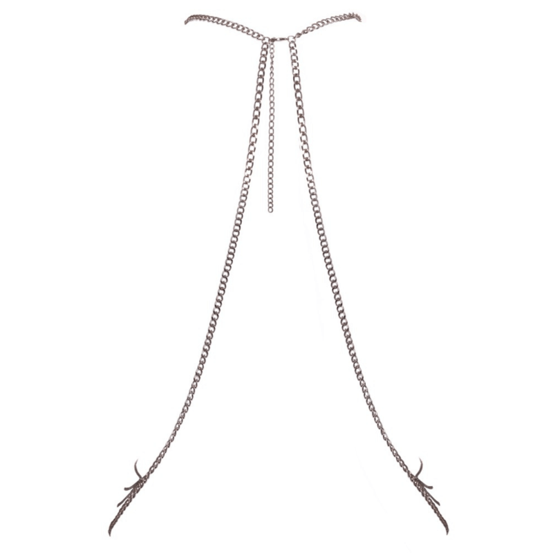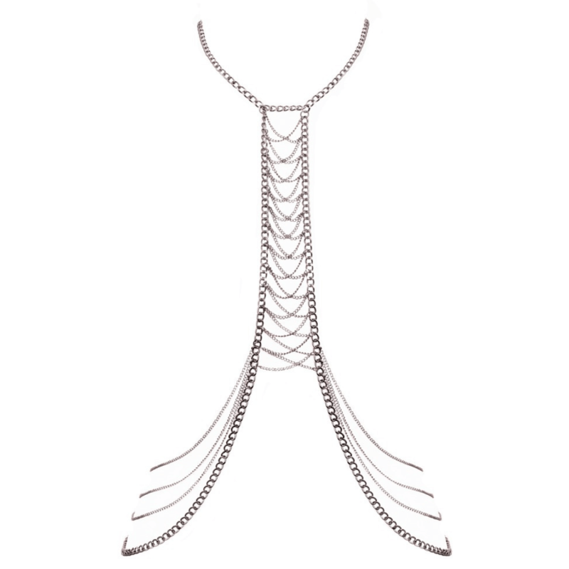 Un look glamour et affirmé, pensé pour attirer tous les regards. Cette chaîne de corps argentée sublime la silhouette grâce à ses chaînettes délicates positionnées entre les seins et au-dessus des hanches, créant un jeu de lignes sensuel et élégant.