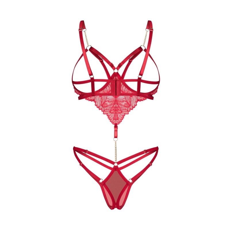 Teddy rouge avec des bonnets ouverts à armatures qui soulèvent doucement le buste. Comprend des bretelles réglables pour un ajustement parfait. Fabriqué à partir de dentelle délicate et de maille. Le devant est orné d’une chaîne dorée qui relie de manière frappante le haut et le bas. Le design à entrejambe ouvert ajoute une touche épicée.