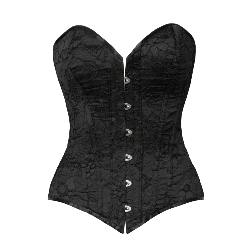 Conçu dans une matière noire douce, il est doté de bonnets couvrants et de baleines de maintien intégrées (6 de chaque côté) qui structurent la silhouette. La fermeture à l’avant se fait par crochets et œillets, tandis que le dos est entièrement lacé pour un ajustement précis. Une pièce de tissu est intégrée sous le laçage.