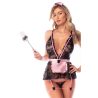 Cet ensemble soubrette en dentelle transparente signé Mapalé séduit par son esprit ludique et sa touche sensuelle. Composé d’un babydoll en dentelle légère, d’un string assorti, d’un tablier décoratif et d’un accessoire de tête, il joue sur un équilibre subtil entre douceur et audace.