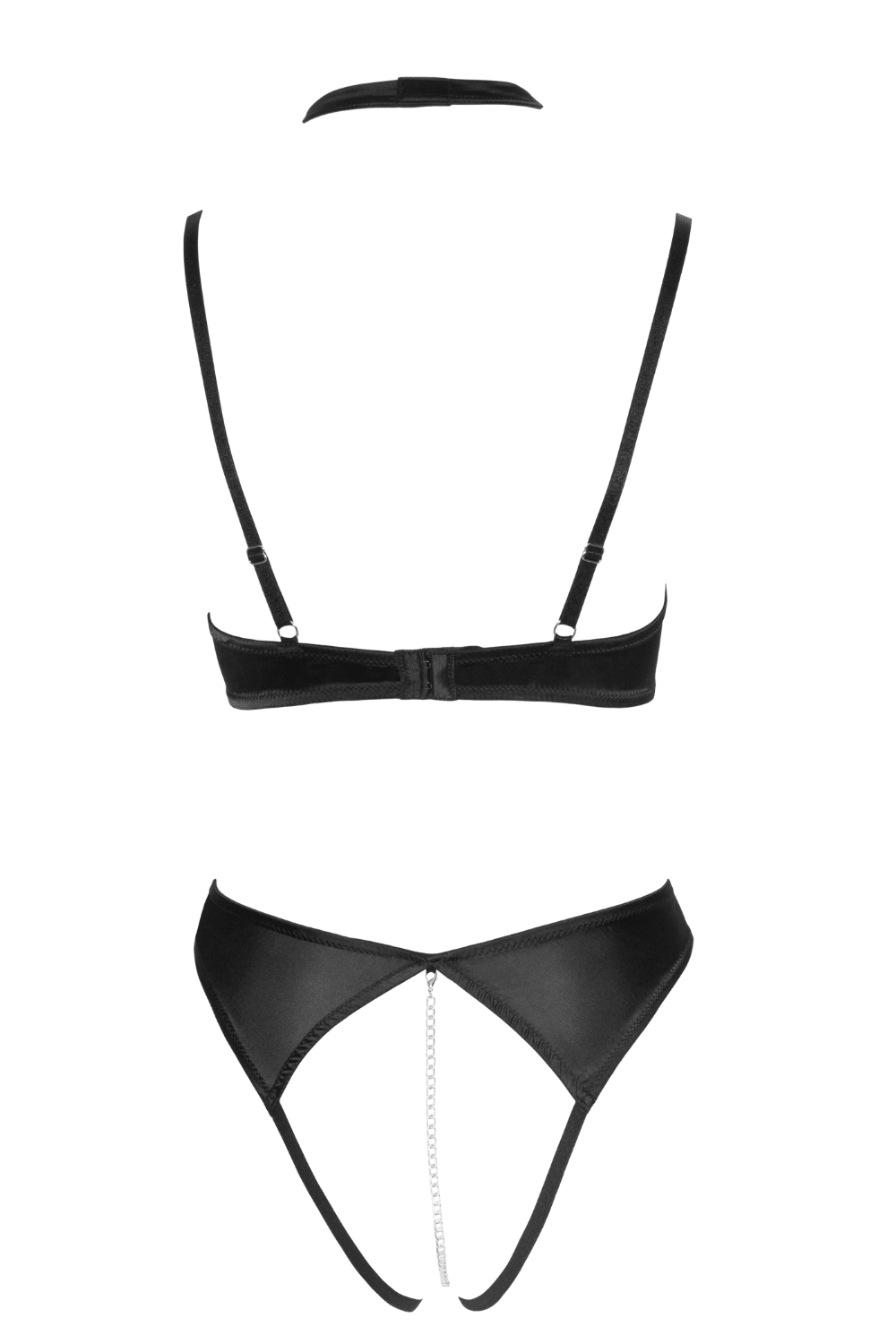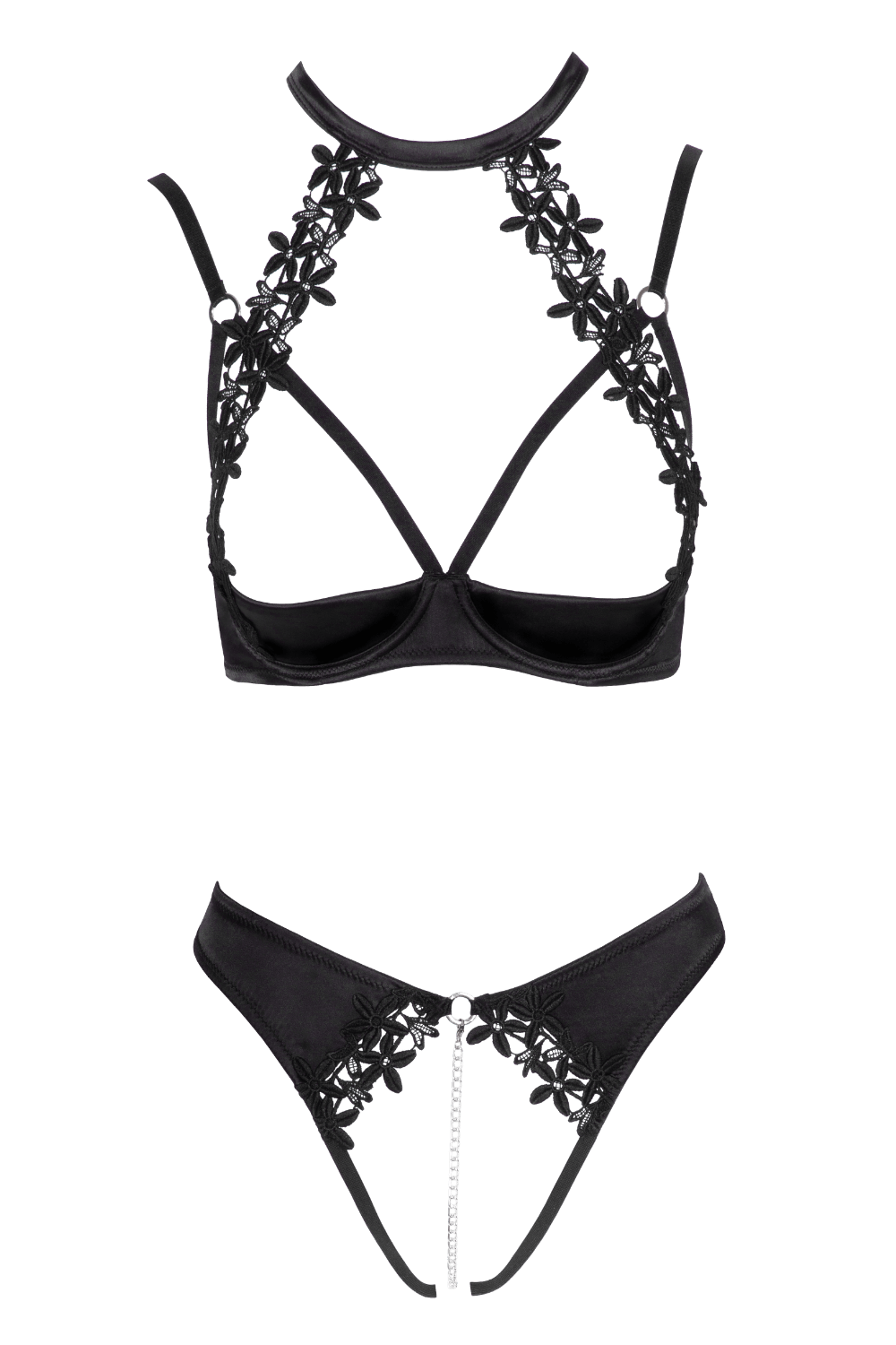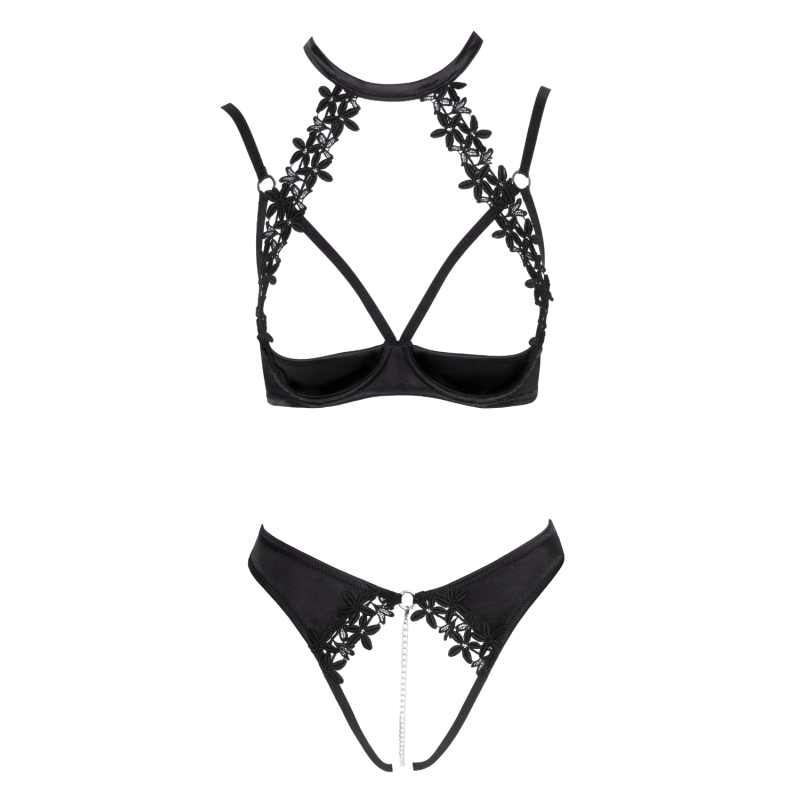 Le string assorti est ouvert à l’entrejambe, avec une broderie à l’avant et une chaîne amovible.