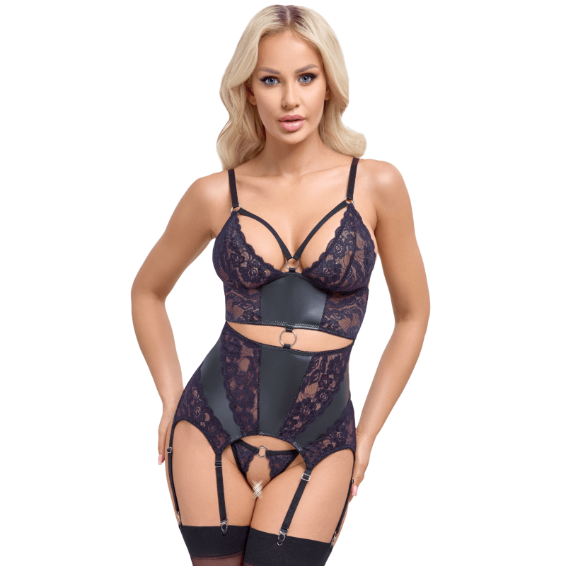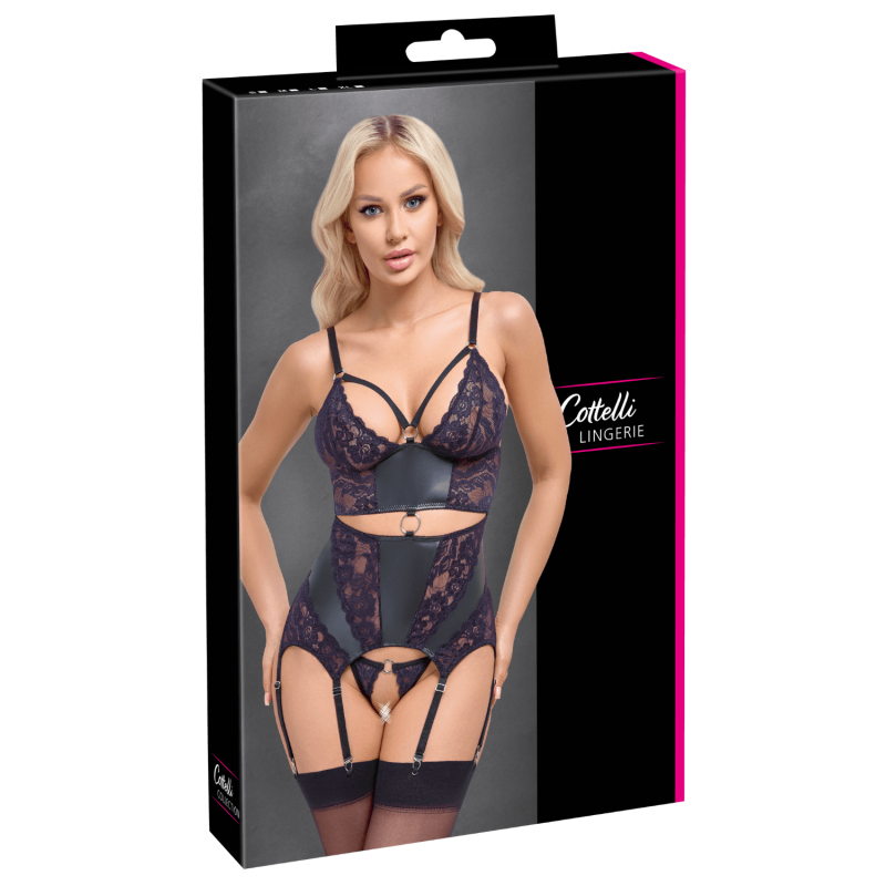 Cet ensemble lingerie 2 pièces signé Cottelli LINGERIE se compose d’une guêpière porte-jarretelles et d’un string assorti.