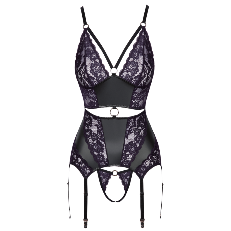 La guêpière associe une matière noire effet mat à des empiècements en dentelle violet foncé à l’avant. Elle présente des sangles décoratives extensibles, des anneaux métalliques ainsi qu’une ouverture décorative à la taille. Les bretelles et les six jarretelles sont réglables, avec une fermeture dos à double crochets.