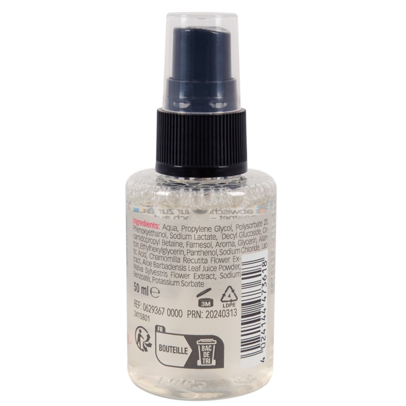 Aqua, Polysorbate 20, Propylene Glycol, Phenoxyethanol, Sodium Lactate, Decyl Glucoside, Cocamidopropyl Betaine, Farnesol, Aroma, Glycerin, Allantoin, Ethylhexylglycerin, Panthenol, Sodium Chloride, Chamomilla Recutita Flower Extract, Lactic Acid, Aloe Barbadensis Leaf Juice Powder, Malva Sylvestris Extract, Potassium Sorbate, Sodium Benzoate.