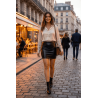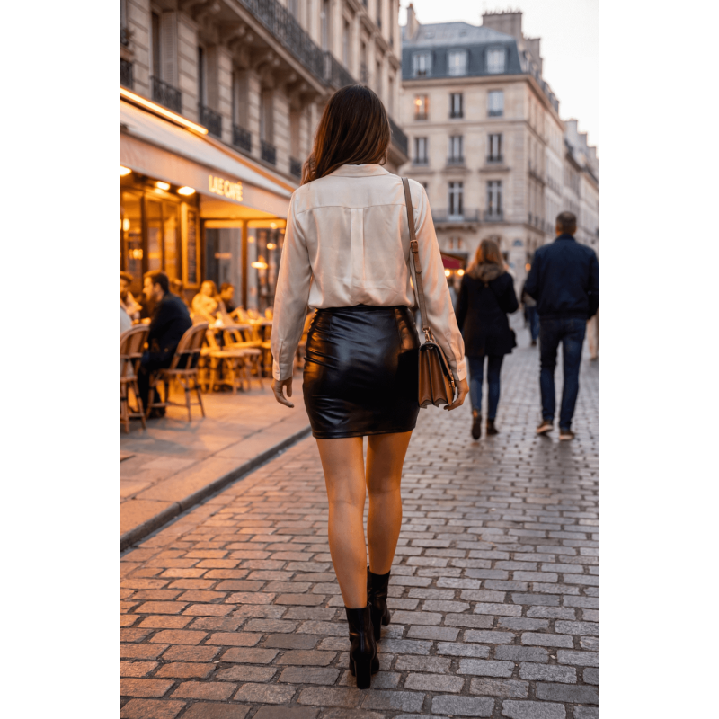 Jupe courte noire Sifia en simili cuir mat, une pièce minimaliste et séduisante, pensée pour un look à la fois moderne, sobre et irrésistiblement sexy. Sa matière effet cuir mat offre une alternative chic au vinyle brillant, pour celles qui préfèrent la sophistication discrète à l’éclat provocateur.
