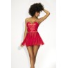 Ensemble lingerie deux pièces qui se transforme en nuisette. Bustier en vinyle avec large décolleté en cœur avec dos lacé. String assorti et jupe transparente amovible.