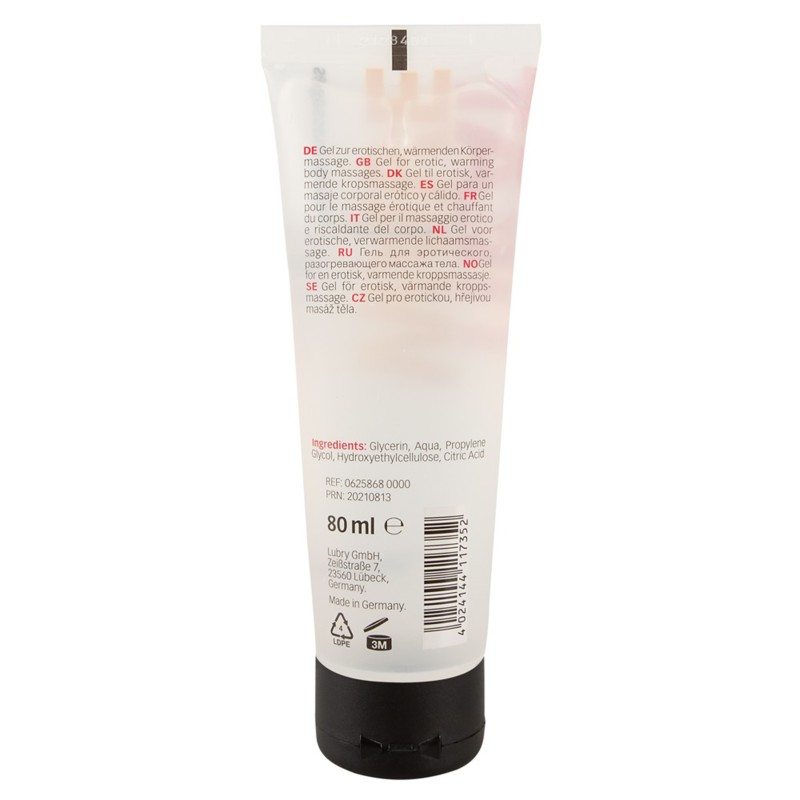 Gel de massage chauffant, la glycérine contenue dans le gel lie l'eau et avec le frottement de la peau, procure une agréable sensation de chaleur pendant le massage, qui s'intensifie encore lorsqu'on respire légèrement dessus. Même une petite quantité garantit une expérience de glisse durable.