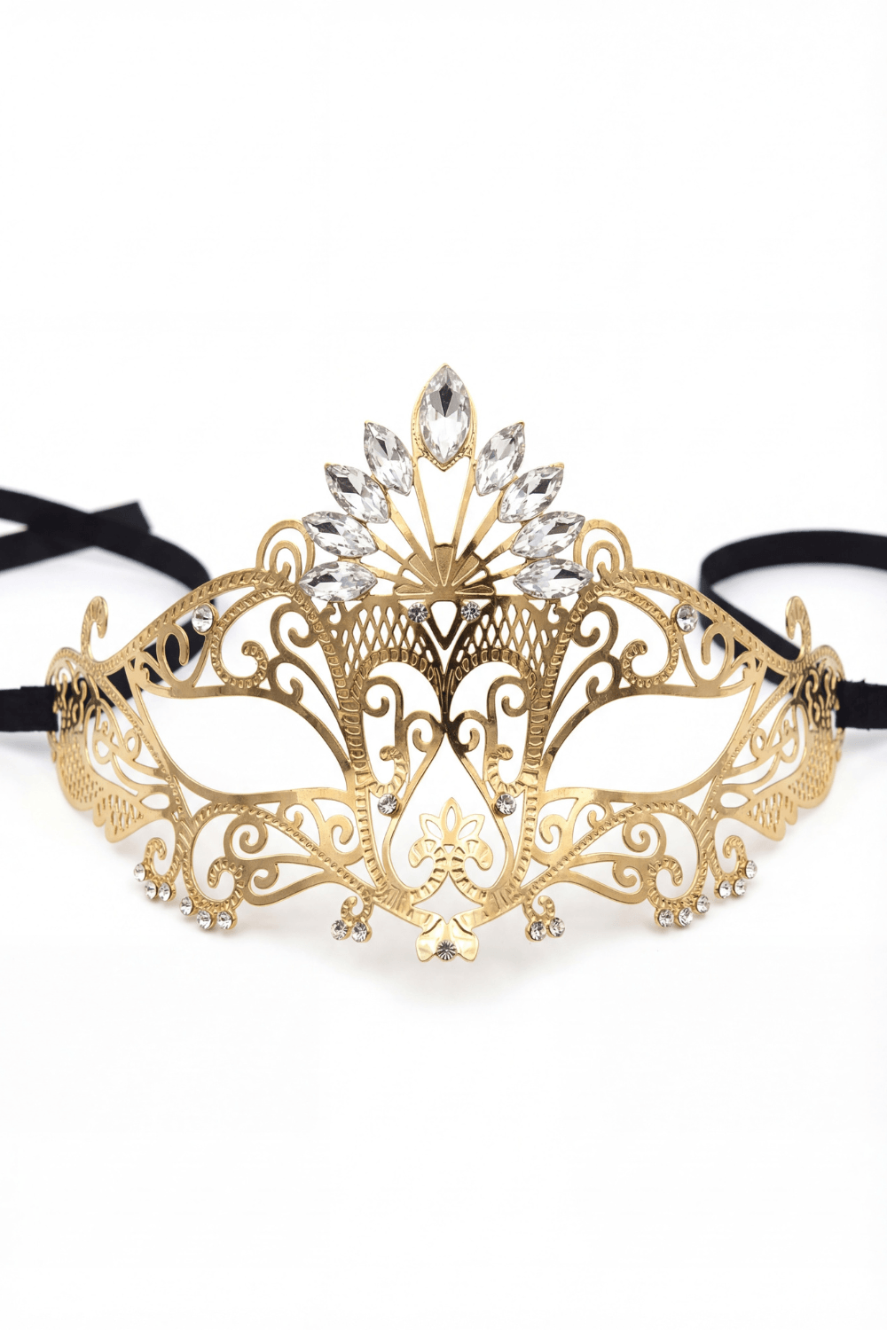 Masque vénitien Gemma rigide doré avec strass de votre grossiste Be lily Accessoiresvente en gros et dropshipping de masques vénitiens en métal et strass.