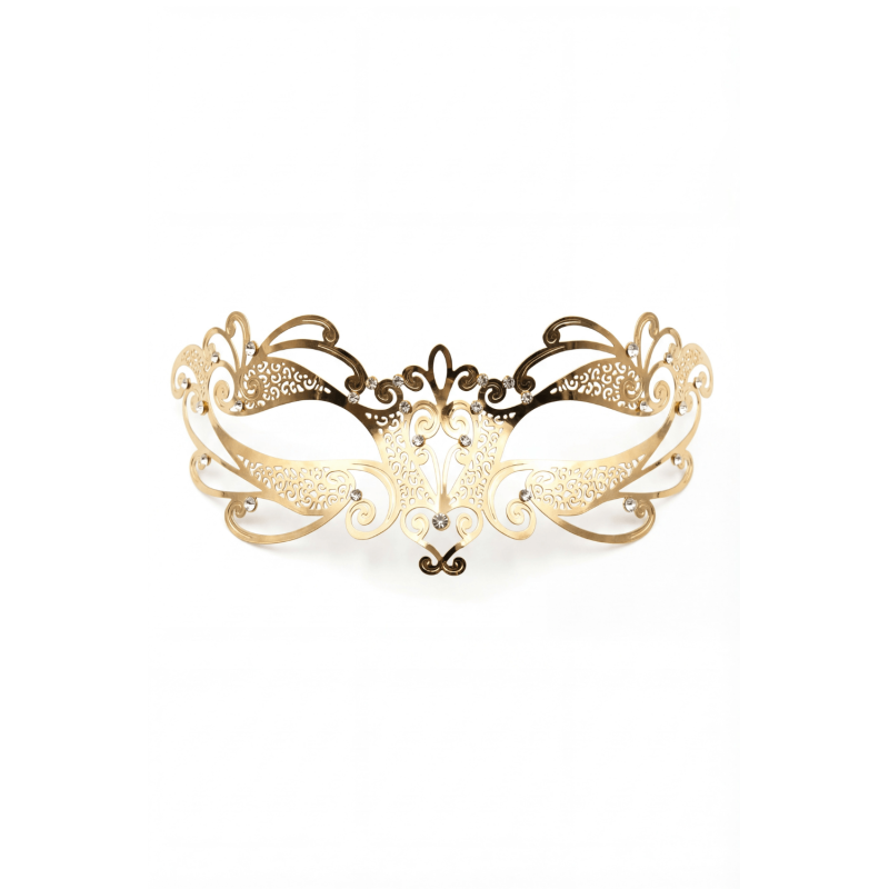 Masque vénitien Gaia rigide doré avec strass de votre grossiste Be lily Accessoires, vente en gros et dropshipping de masques vénitiens en métal et strass.