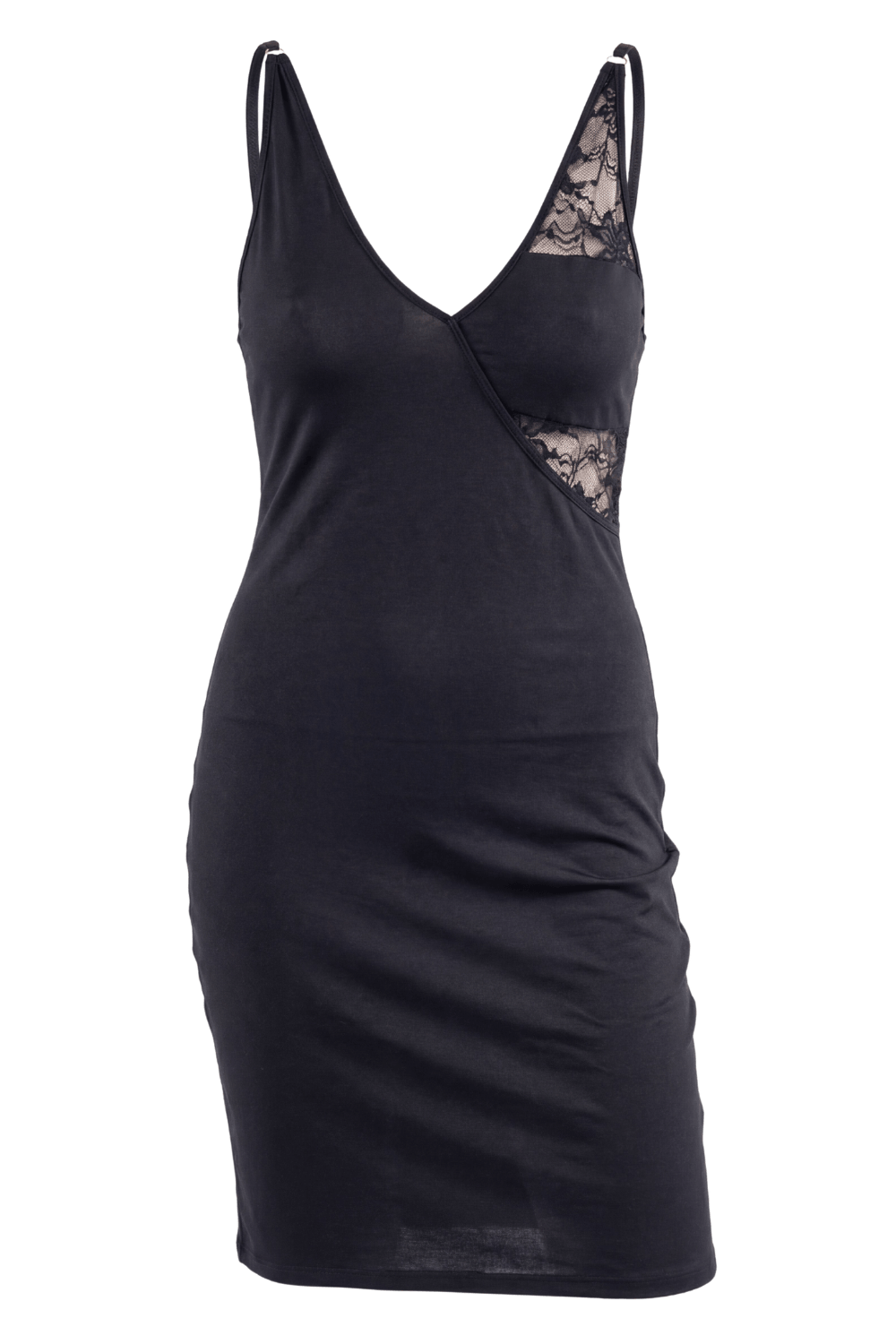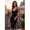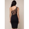 Robe sexy noire avec large décollectée qui joue entre opacité et transparence dans un jeu de sensualité. Tissu noir élastique pour épouser votre silhouette. Le dos en dentelle florale ne vous laissera pas insensible. Bretelles réglables.