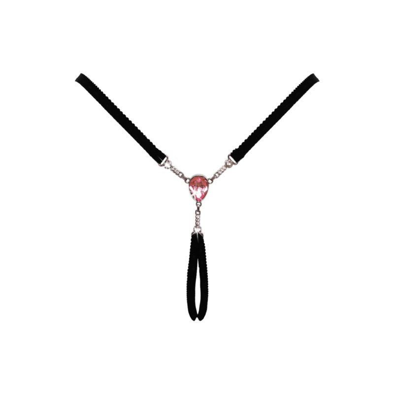 À l’avant, une grande pierre décorative rose attire le regard, accompagnée de chaînettes argentées ornées de petites pierres scintillantes pour une finition élégante et sensuelle.